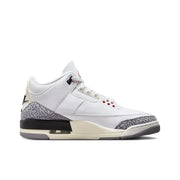 The Air Jordan 3 Retro "White Cement Reimagined" pays homage to the iconic silhouette that debuted in the late '80s. This version features a classic white leather upper, accented with the signature black and red details that fans adore. The beloved elephant print overlays on the toe and heel add texture and heritage appeal. The midsole boasts a clean white finish, while the visible Air unit provides comfort and style. With its timeless design, the "White Cement Reimagined" perfectly blends nostalgia with modern flair, making it a must-have for sneaker enthusiasts and collectors alike.