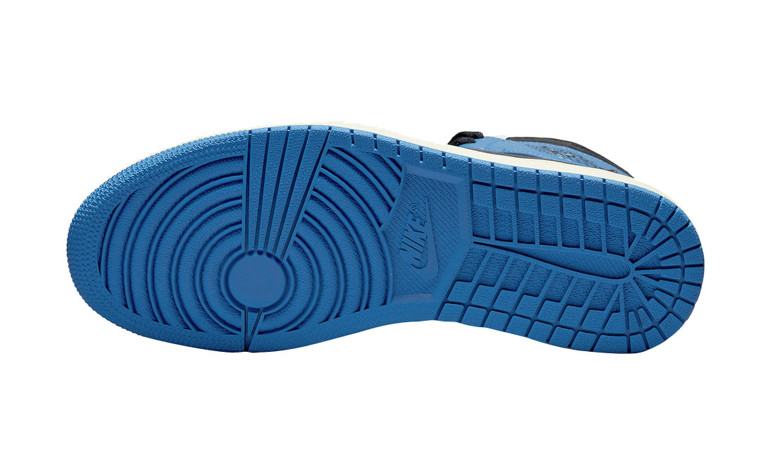This Air Jordan 1 High OG features a soft leather upper in Sail, Military Blue, and Black all throughout the upper. Highlights include Travis’ reverse Swooshes in black on the Sail leather side panels, Military Blue detailing on the toes, ankle, and heel, Cactus Jack and Fragment Design tags on the tongues, the Cactus Jack smiley face and fragment’s lightning bolt embroidered on the heels, Sail midsoles with black text, and royal blue rubber outsoles.